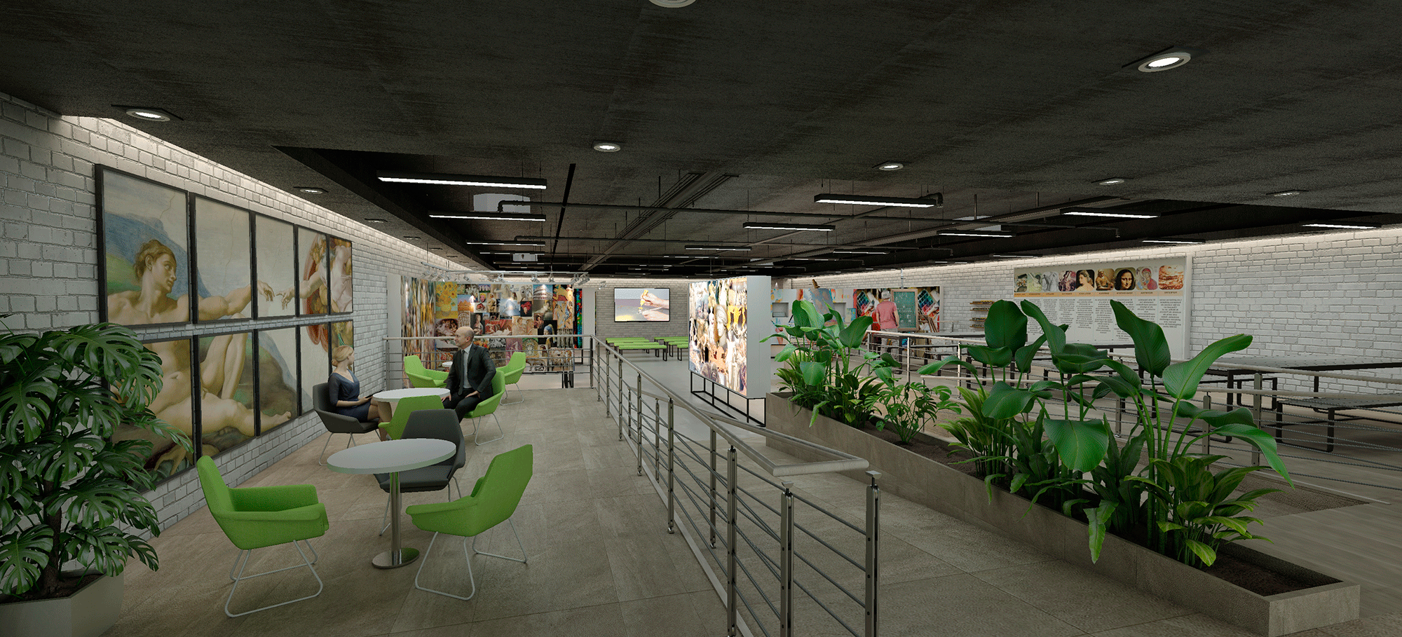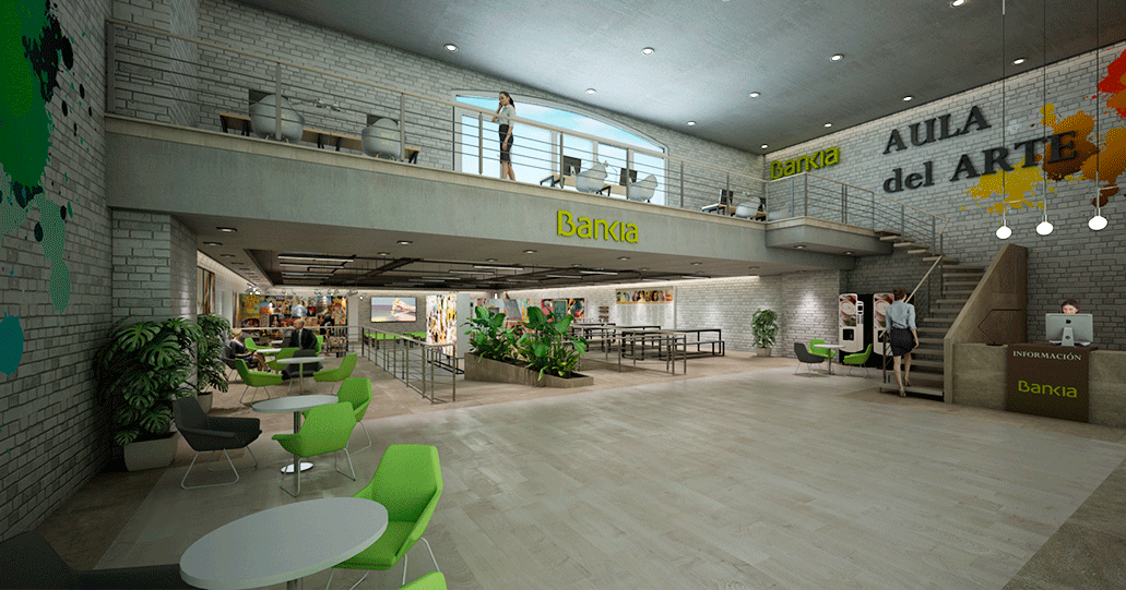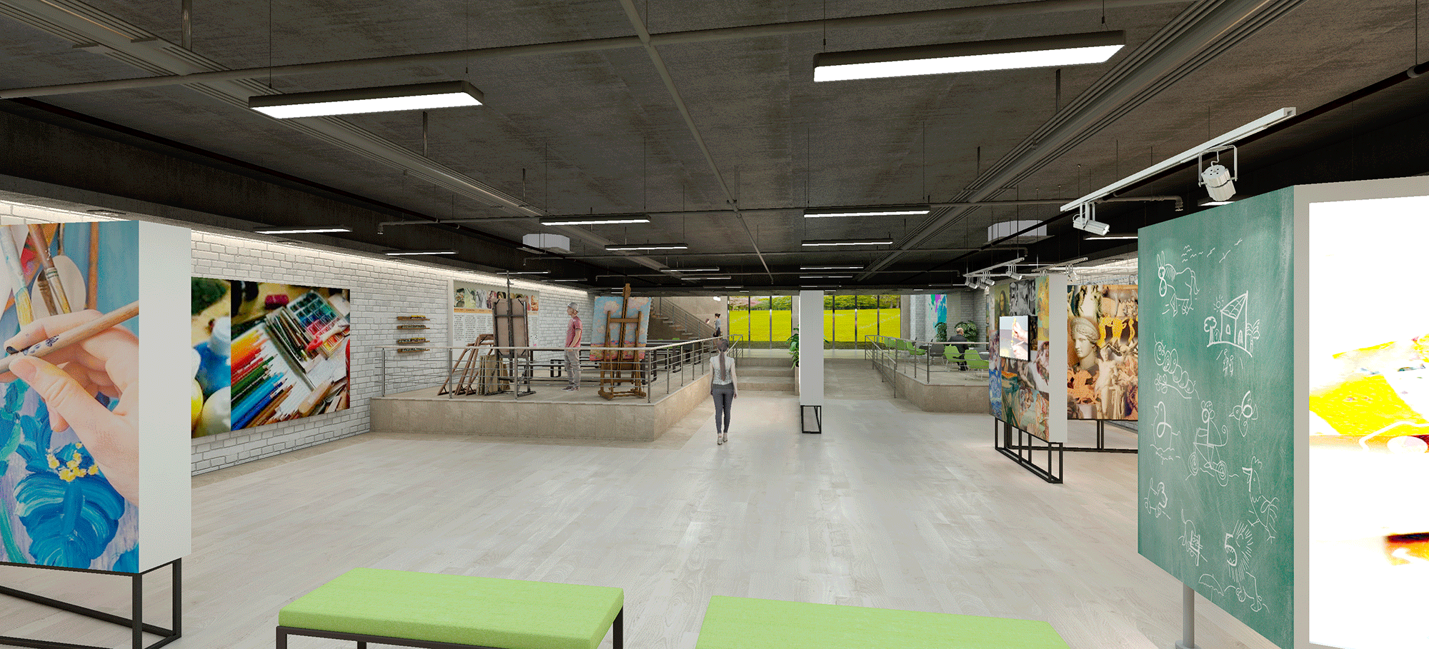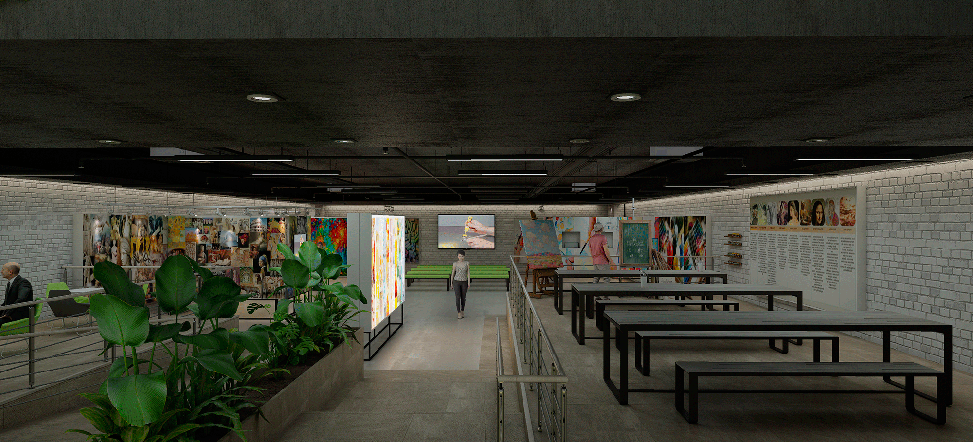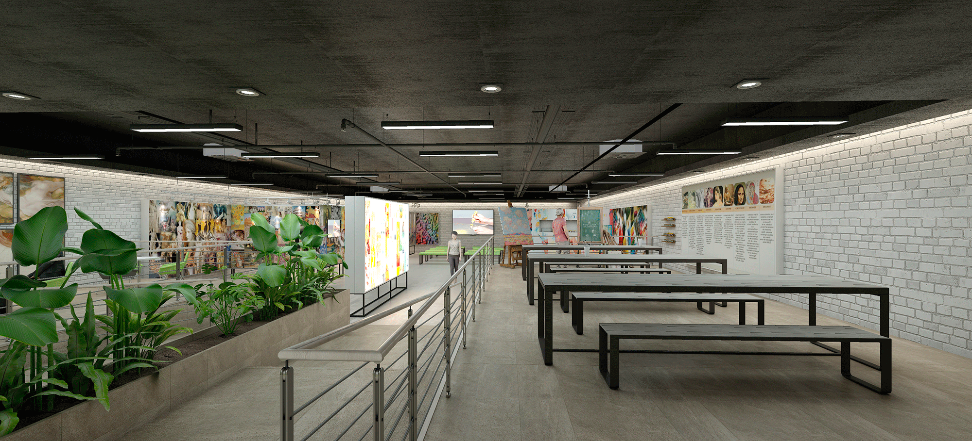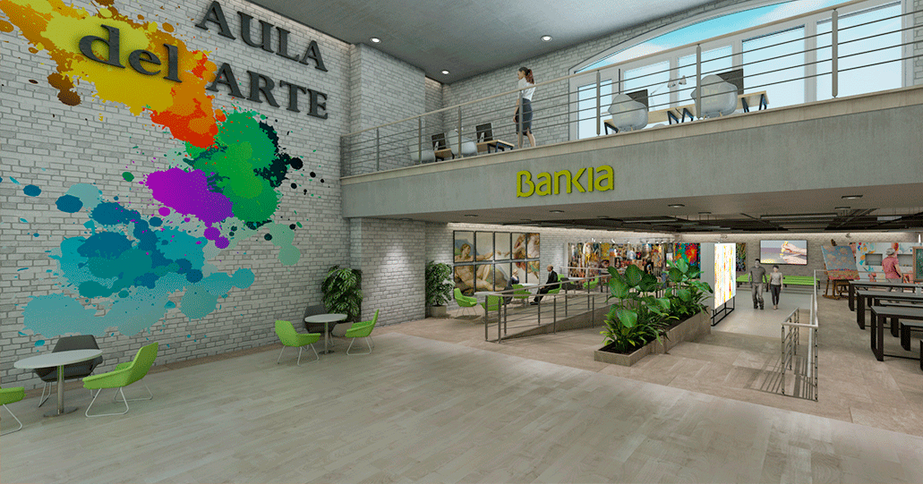 Espacio para talleres de pintura mediante mesas corridas. Espacio de atención al cliente y profesorado.