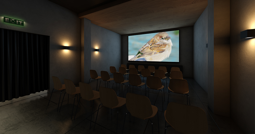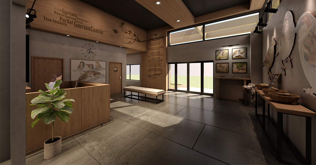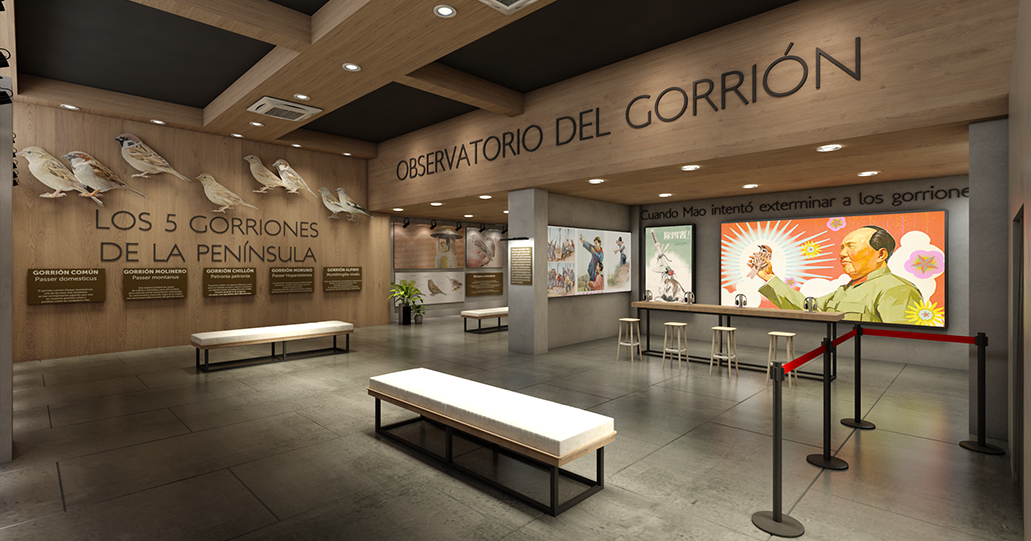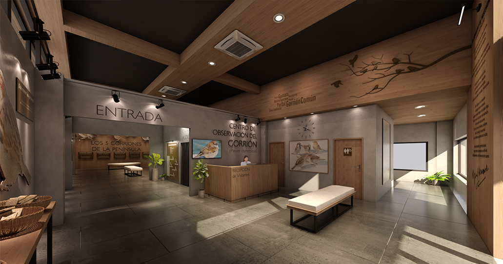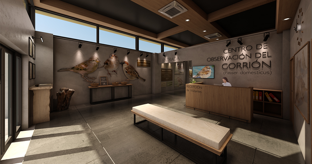 Exposición con audiovisuales y gráfica sobre la temática del gorrión. Recepción de visitantes, mobiliario, gráfica y salas de audiovisuales.